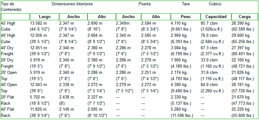 La tara o peso del contenedor puede ir de 1,8t hasta 4t para los de 20′ y de 3,2t a 4,8t para los de 40′.